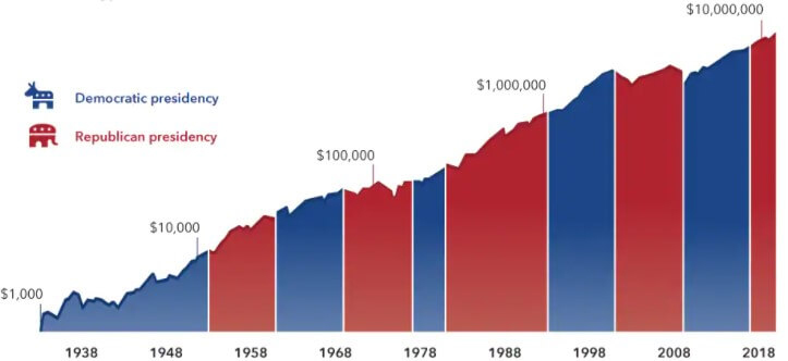 The chart below should be self-explanatory. An investor invested US$1,000 during the time when a Democrat, Franklin D. Roosevelt was a US President in 1938. Over the course of history, he would have invested under fourteen different US Presidents, seven Democrats and seven Republicans. He would end up more than US$10 million today, a return of more than 10,000x. No matter how diverse the two parties are, it doesn't matter significantly to the stock market, especially on a long-term outlook. Despite the differences in policies, both parties ultimately have one major agenda which to build the economy of the country.