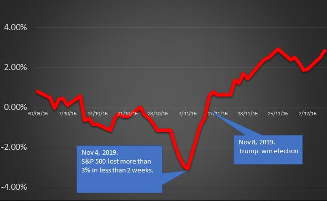 But things turned for the worst when most investors got caught almost immediately after the stock market made a sharp U-turn. By the election day on 8 November 2016, all the earlier losses were entirely reversed.