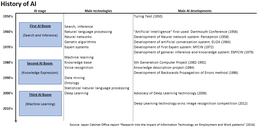 When the older AI researchers get together, the conversation often turns to "Is this time different?". The current boom is said to be the third time that AI has been widely picked up by the mass media (see chart above) I remember the last boom, at that time I was doing AI research at university. In 1982, a national project called the "5th Generation Computer Project" was launched in Japan, and a huge national budget of 57 billion yen was invested. However, expectations for AI were very high and, when it failed to meet those expectations, the boom ended with disappointment, so my generation is the “second AI boom frustration generation”. The question of whether this time is different from the last boom has become a big topic among the older generation of AI researchers. The current situation of AI, whatever you think, reminds them of the last boom. Furthermore, the machine learning technology called “deep learning”, which is most often cited as the state-of-the-art AI technology, is in fact just a refinement of earlier technology called neural network (an algorithm that mimics the neural structure of the brain) that was actually developed in the first AI boom era. In other words, AI itself cannot be said to have made “revolutionary” technological progress since it is just a refinement of earlier work. So, will it end with a mere boom and excessive expectations this time around too?