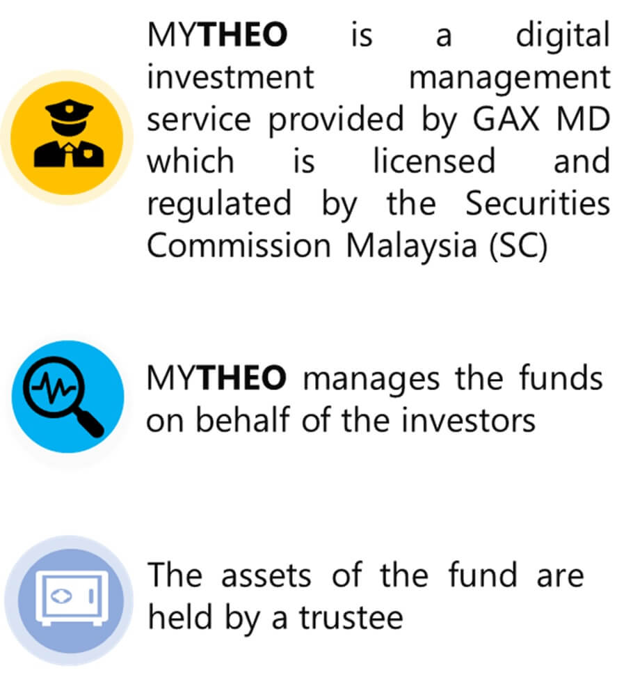 To ensure the safety of your funds, all investment monies are handled by a trustee. A trustee is a 3rd party firm that holds and administers property or funds solely for specific purposes. In this case, MYTHEO has no access to investor funds whatsoever and all deposits and withdrawals are handled by our 3rd party trustee to ensure compliance, full transparency and integrity. For further understanding you may refer to the infographic below or read more here.
