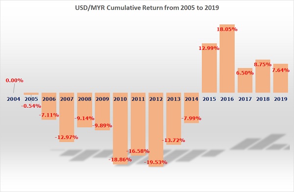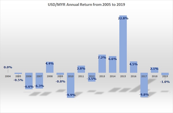 Chart 3: USD/MYR Annual Returns from 2005 to 2019