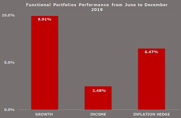 The above graph shows the performance of MYTHEO's functional portfolios since its inception in June 2019 to December 2019. The Growth portfolio registered a return of 9.91%, the Income portfolio was up by 2.48% and the Inflation Hedge portfolio gained 6.47%. The returns for the stipulated period was positive across all functional portfolios despite the ups and down in month-to-month performance.