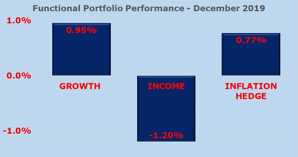 The currency movement had a significant impact on the functional portfolios’ performance in December 2019. Weaker USD led to a better performance of the Non-US assets and commodity-related asset classes. The Growth portfolio was up by 0.95%, driven by the rally in the stock market. The Inflation Hedge portfolio advanced by 0.77%, supported by the rally in commodities prices, but the Income portfolio was down by 1.20% due to the continued rise in bond yield.