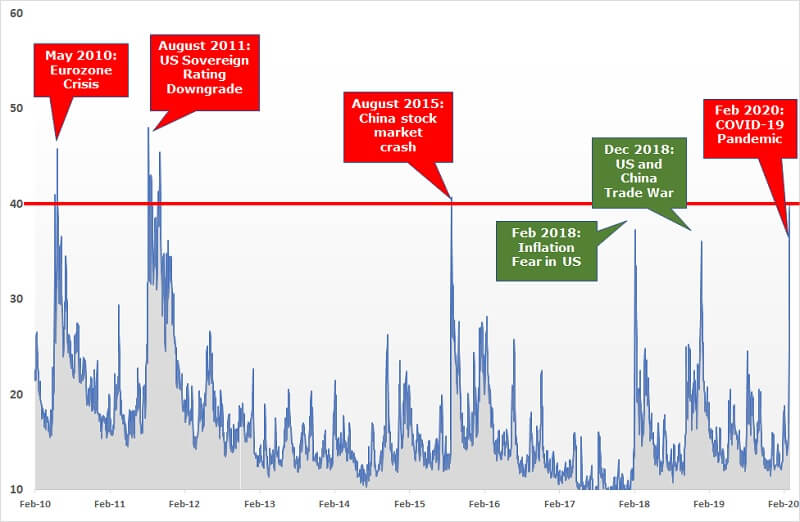 At the end of February, the index leveled at 40.11 points. It was the fourth time that it has surpassed 40 points post the financial crisis in 2008. On normal trading days, the Index usually trades between 10 to 15 points. At times when there is bad news, the fear Index spikes up to above 20 points. However, when the index hits above 40 points, it might indicate that the market “fear” has already hit an extreme and is unlikely to sustain, and financial markets are more likely to rebound from this level.