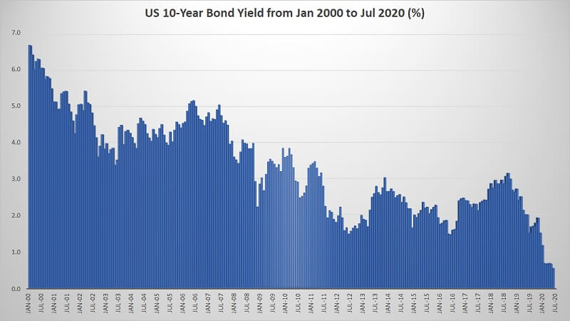 As you can see from the chart above, the US 10-year bond yield has been trending downwards for few decades. At the end of July, the bond yield traded to a new record low of 0.533%, as investors continued to buy more on expectations that the interest rate will not rise anytime soon.