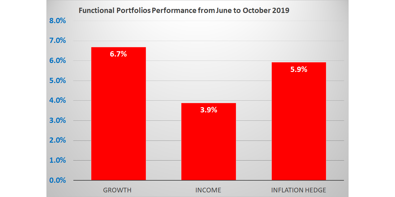 All MYTHEO functional portfolios delivered a solid return since its inception in June 2019. In the first five months, from June 2019 to October 2019, the Growth portfolio showed a positive return of 6.7%, Income portfolio rose by 3.9% and Inflation Hedge portfolio gained by 5.9%.