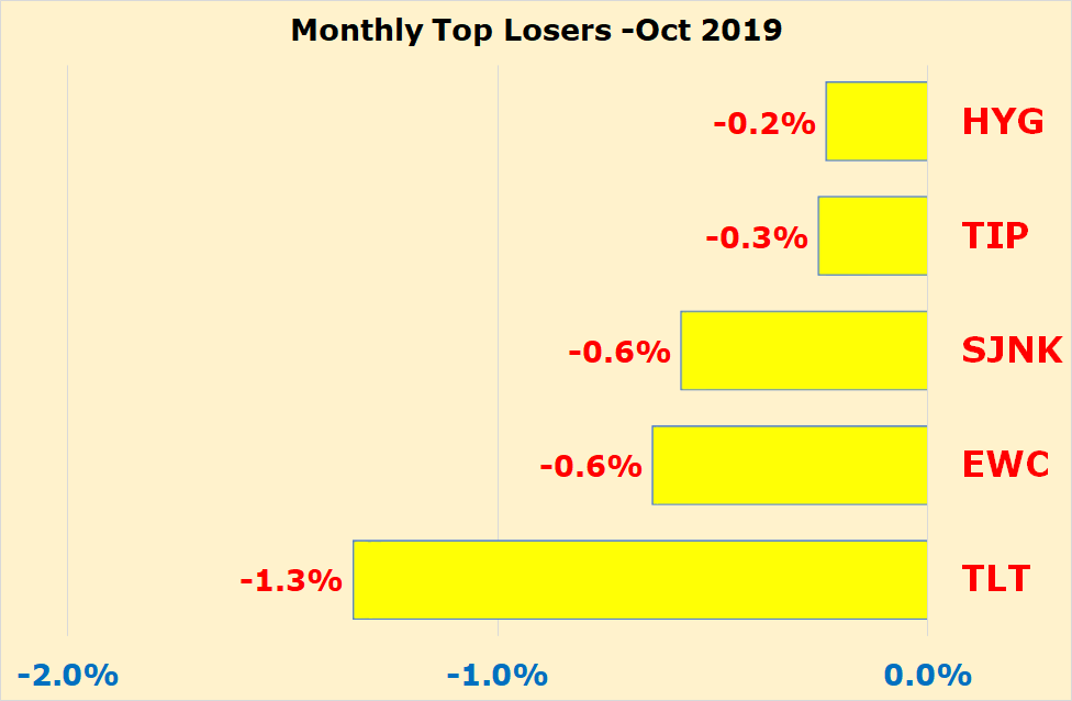 Inflation hedge portfolio performance was consistent with the trend we saw in the income portfolio. The ETF that holds non-USD assets in underlying securities performed well in October. Within the inflation hedge portfolio, SPDR Dow Jones International Real Estate ETF (RWX) was the top gainer in October with a return of 3.5%.