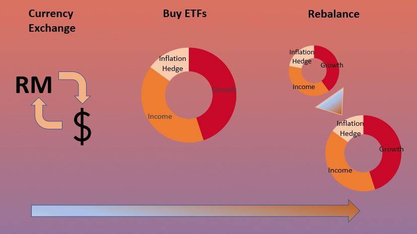 Investors deposit Ringgit in the trust account. The ETFs purchased for investors are denominated in US Dollars so MYTHEO does a currency trade to switch the Ringgits to US Dollars. Most asset managers charge a commission for currency exchanges but MYTHEO does not charge any commission. In other words, the exchange fee is zero. This means that the exchange rates enjoyed by investors are actually at a more favorable rate than that displayed at the bank.