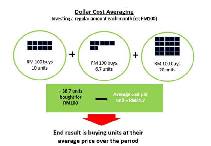 As explained above, if you invest same amount each month, even though the price might be high one month or low the next, by continuing to purchase at a constant amount for a long time, you can invest in the security at its average price.