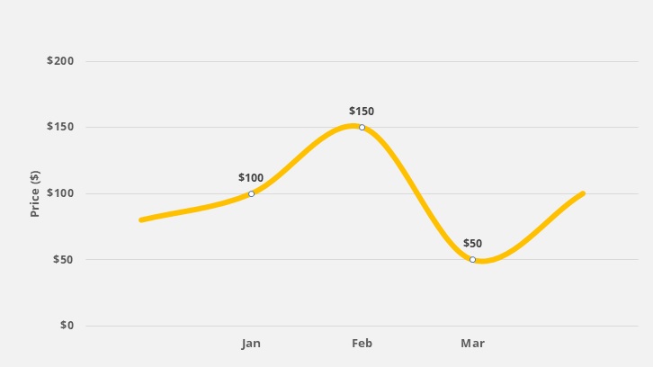 Consider the case shown in the above diagram. For example, suppose you buy $300 worth of stock. How many can you buy in February? $300 ÷ $150 = 2, so 2 shares. How about in March? $300 ÷ $50 = 6 i.e. 6 shares. If the stock price changes as shown in this figure, the cheapest purchase time is March. If the price of stocks purchased in March then rose, you could say that you were able to gain more than you did in February. In this way, you can see that the best investment timing is “when the market (stock price, etc.) is falling”.
